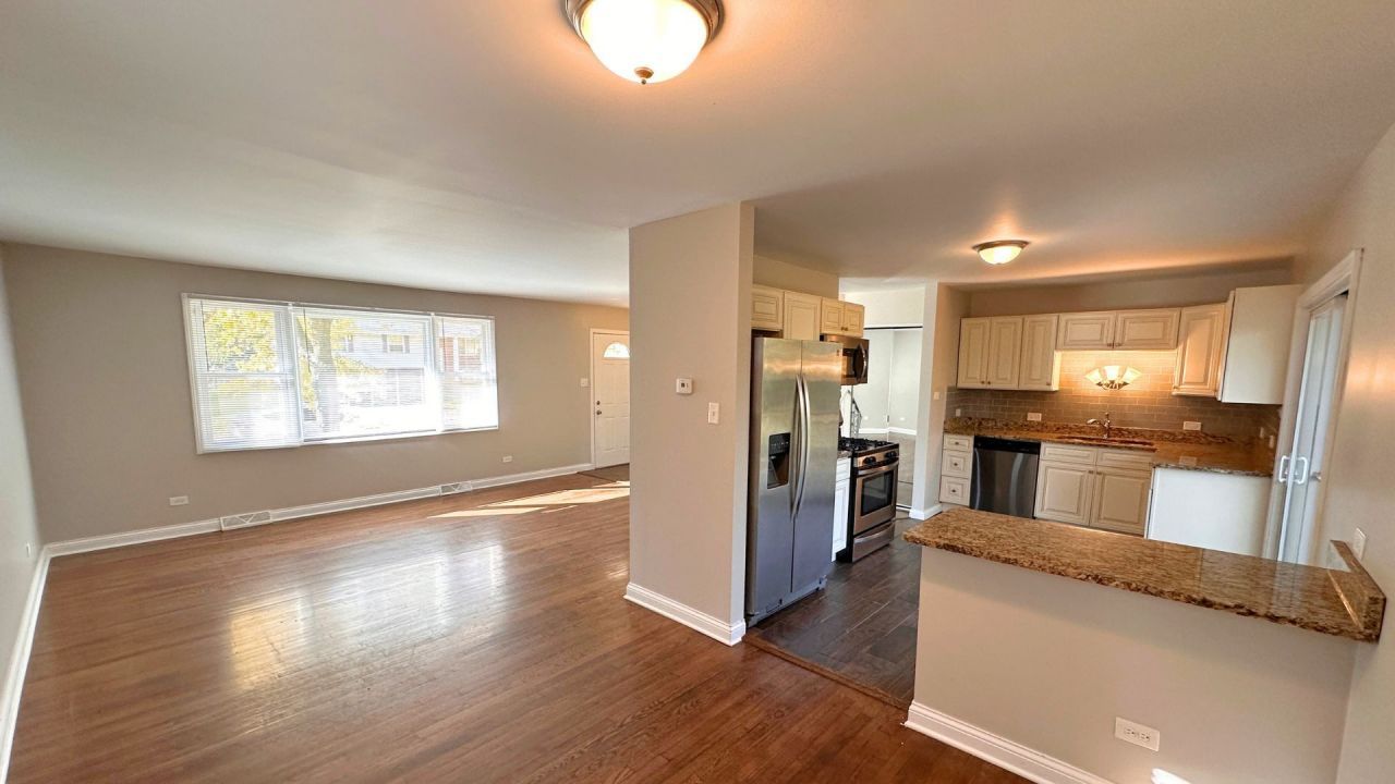 Welcome to 3214 Birchwood Drive, a beautifully updated 3-bedroom, 2-bath split-level home offering 1,223 square feet of bright, comfortable living space in a quiet residential neighborhood. Step into a spacious main living area with rich dark wood floors and oversized windows that flood the space with natural light and overlook the front yard. The kitchen is a true highlight, featuring granite countertops, custom cabinetry with detailed finishes, stainless steel appliances including a gas stovetop, oven range, and dishwasher, and a stunning glass tile backsplash. Enjoy casual meals in the dedicated dining nook just off the kitchen, with sliding glass doors that lead to a private, fenced-in backyard surrounded by trees and perimeter greenery. It's perfect for privacy, relaxation, and outdoor gatherings. Upstairs, hardwood floors run throughout all three bedrooms. Each room is uniquely laid out and includes large windows, ample closet space, crown molding, and excellent natural light. The shared full bathroom on this level features elegant custom tile work and a granite-topped vanity. The lower level offers a second large living area with fresh carpet, portrait windows, and direct access to the front yard. A second full bathroom is finished with tile flooring and a granite vanity, along with convenient walk-out access to the attached one-car garage. The exterior features classic yellow brick and vinyl siding, a private driveway, and a fully fenced yard in a peaceful, established neighborhood. Located in Hazel Crest, this suburban village offers access to green spaces, top employers like Advocate South Suburban Hospital, and easy commuting via nearby interstates and Metra service to downtown Chicago. Known for its community ties and affordability, Hazel Crest is a popular choice for first time home buyers. Move-in ready and full of charm, this is one you won't want to miss.